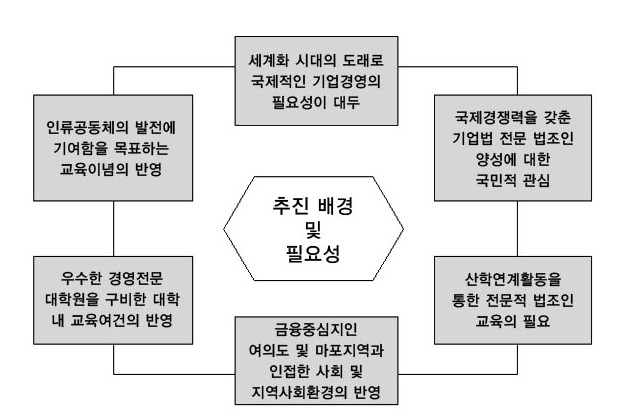 금융법 및 기업법관련 특성화과목의 교육과 외국어 및 국제화 과목의 교육을 통하여 올바른 가치관을 갖춘 이웃과 국가에 봉사하는 법조인을 양성합니다.