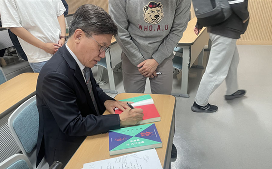 박형남 판사가 직접 자신의 저서에 서명하여 학생들에게 선물하는 모습