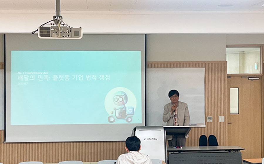 지난 6월 7일 본교는 우아한 형제들 부사장을 맡고 있는 함윤식 변호사를 초청하여 법학전문대학원생들을 대상으로 특별강연을 개최했다. 함윤식 변호사는 ‘플랫폼/배달앱의 주요 법적 쟁점’을 주제로 주요 법적 쟁점 3가지 (플랫폼 기업에 대한 규제 논의, 리뷰와 관련된 인격권과 표현의 자유, 라이더의 근로자성과 관련된 법적 쟁점) 를 소개했다.