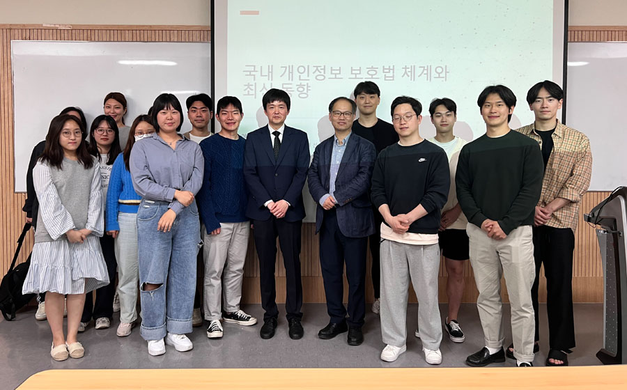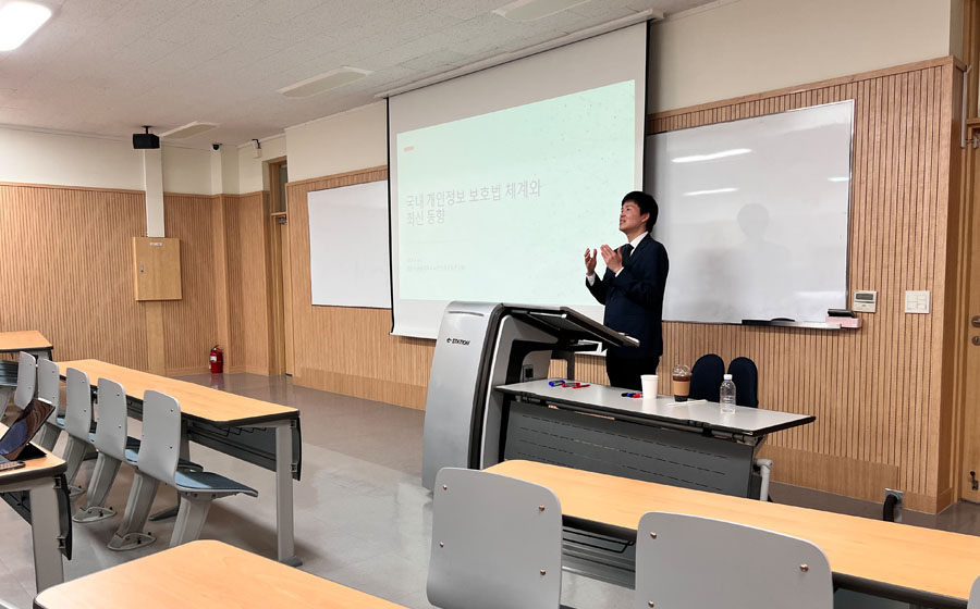 본교 인공지능법학회(지도교수 홍대식 교수)는 지난 5월 11일(목) 김은수 서울대학교 AI연구원 선임연구원을 초빙하여 대한민국 개인정보보호법의 법제 체계와 최신 동향이라는 주제로 세미나를 개최하였다. 이 날 행사에는 연사인 김은수 연구원 및 홍대식 교수와 인공지능법학회 학생들, 그리고 개인정보보호법제에 관심이 있는 학내 구성원들이 참석하였다.