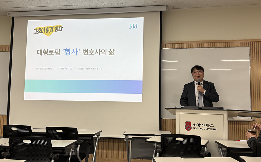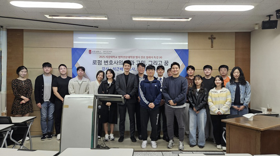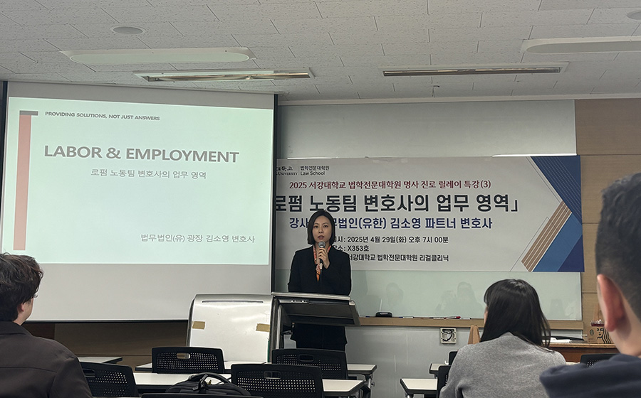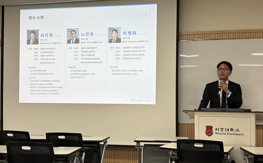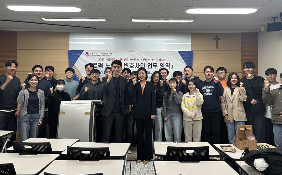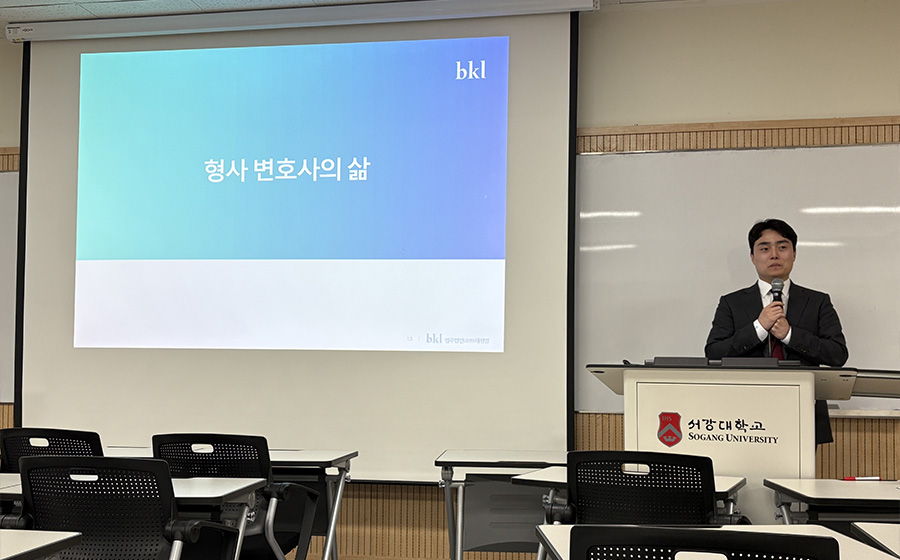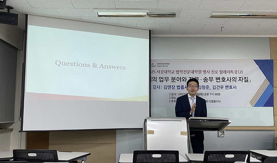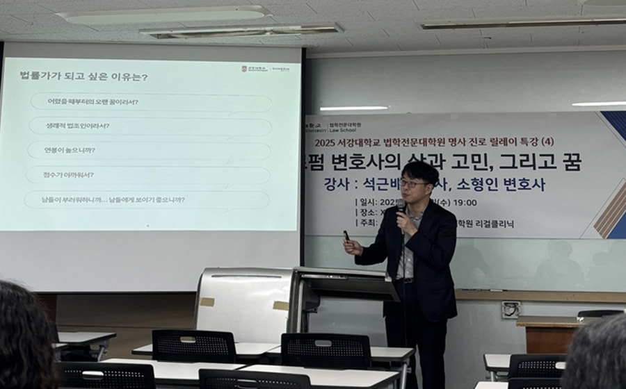 서강대학교 법학전문대학원이 주최한 명사 진로 릴레이 특강이 지난 2025년 5월 7일, 법무법인(유) 세종의 강연을 끝으로 성공적으로 마무리됐다. 법무법인 세종의 석근배 공정거래팀 파트너 변호사와 소형인 변호사가 참여해 ‘로펌 변호사의 삶과 고민, 그리고 꿈’을 주제로 진행되었으며, 법무법인에서의 취업을 준비하는 학생들에게 실질적인 조언을 제공하고, 변호사로서의 커리어를 설계하는 데 도움을 주었다.