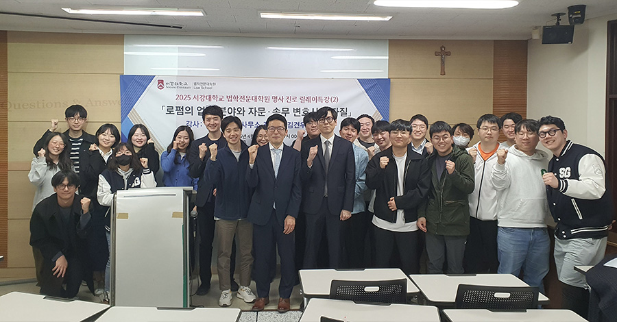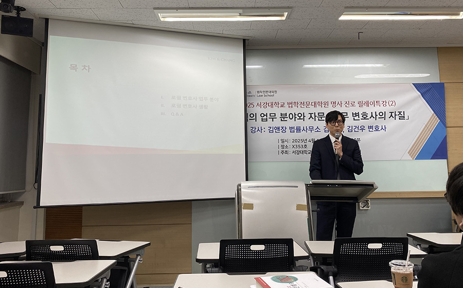 2025년 4월 10일 오후 7시, 서강대학교 법학전문대학원 하비에르관 X353호에서 명사 진로 릴레이 특강 시리즈의 두 번째 강연이 열렸다. 이번 특강은 ‘로펌의 업무 분야와 자문·송무 변호사의 자질’을 주제로 진행되었으며, 김앤장 법률사무소의 김형준 변호사, 김건우 변호사가 연사로 참여해 대형 로펌의 체계, 변호사의 역할, 업무 분담 등 생생한 이야기를 전하여 뜨거운 관심을 받았다. 강연은 로펌 변호사의 업무 분야와 생활, 질의응답 순서로 진행되었다.