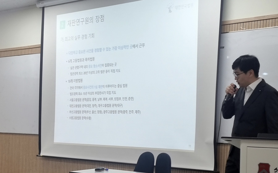 이 교수가 재판연구원 제도 및 현황, 재판연구원의 장점, 2026년도 임용에 대한 재판연구원 선발절차 및 일정에 대하여 소개하였다. 재판연구원은 2023년부터 꾸준히 정원이 증원되었으며 앞으로도 정부와 직제협의를 통해서 지속적으로 증원을 추진할 계획이라고 전했다. 이 교수의 설명에 따르면, 법학전문대학원 졸업 후 즉시 임용되는 절차의 경우 일반전형과 필기면제전형으로 나누어 재판연구원을 선발 하게 된다. 일반전형에서는 다음의 3개의 전형을 모두 거쳐야 한다. 1차 서류전형에서는 2학년 2학기까지의 학업성적과 민사·형사 재판실무강의 성적, 가인법정변론경연대회 수상경력 등이 반영된다. 2차 필기 전형에서는 사례형 및 기록형 문제 문제를 약 3시간 30분 동안 푸는 민사 필기시험과 기록형 문제를 약 3시간 동안 푸는 형사 필기시험을 거치게 된다. 마지막으로 3차 인성면접 전형에서는 20분 동안 지원 동기, 재판연구원으로서의 포부, 사법제도 등에 관한 비전형적 질문에 답을 해야 한다. 일반전형과 달리 필기면제전형은 위 2차 필기 전형을 치르지 않아도 되는데, 민사·형사 재판실무강의 성적을 주요한 심사 자료로 판단하여 대상자를 선발한다.